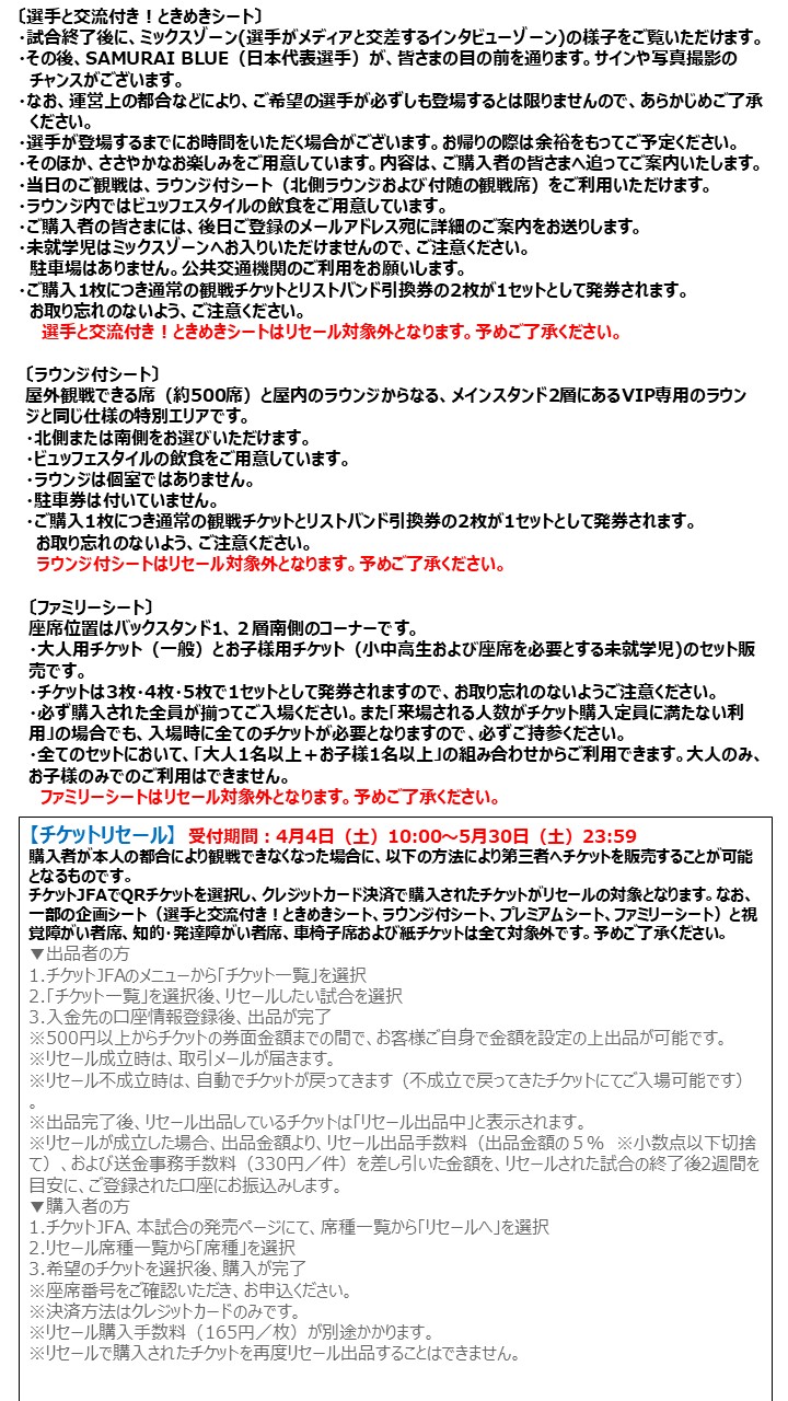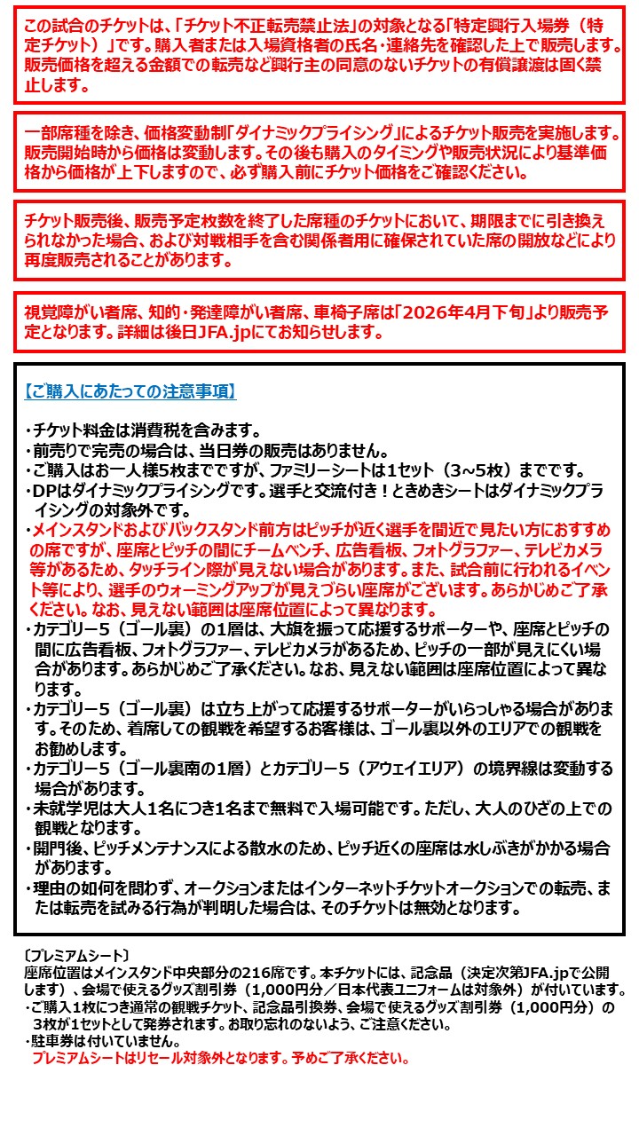 キックオフ時間は予定のため変更の場合あり。未就学児童は、大人1名につき1名まで膝上無料。お席が必要な場合はチケットが必要。この試合のチケットは「チケット不正転売禁止法」の対象となる「特定興行入場券(特定チケット)」です。購入者または入場資格者の氏名・連絡先を確認した上で販売します。販売価格を超える金額での転売など興行主の同意のないチケットの有償譲渡は固く禁止します。公式リセールの取引開始は2026年4月4日(土)10:00~チケットJFAでQRチケットを選択し、クレジットカード決済で購入されたチケットがリセールの出品対象(一部の企画シート(選手と交流付き!ときめきシート、ラウンジ付シート、プレミアムシート、ファミリーシート)および紙チケットは全て対象外)です。